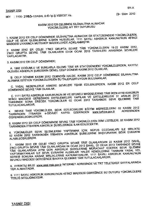 KASIM 2012 ER CELBİNDE SİLAHALTINA ALINACAK YÜKÜMLÜLERE AİT TRT DUYURUSU