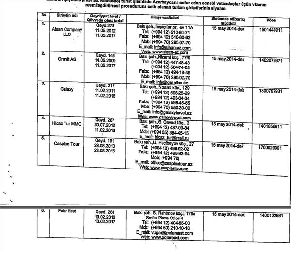 Azerbaycan'a seyahat etmek isteyen vatandaşlarımız, ekte listesi sunulan lisanslı turizm firmalarınınweb sayfalarıüzerinden elektronik vize başvurusunda bulunabilirler. Dilekçe, pasaportun ilgili sayfaları ile fotoğrafın elektronik ortamda taratılması suretiyle elektronikortamda yapılacakvize başvurularıAzerbaycan Cumhuriyeti Dışişleri Bakanlığı tarafından 15 gün içinde sonuçlandırılacaktır.