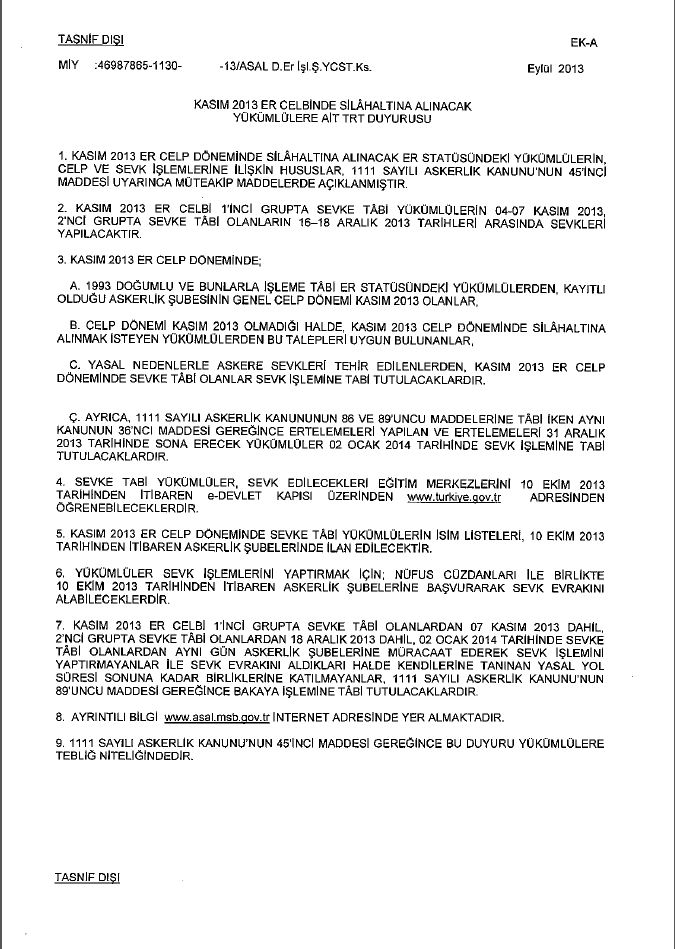 Kasım 2013 er celp döneminde silah altına alınacak er statüsündeki yükümlülerin, celp ve sevk faaliyetlerine ilişkin tebliğ yerine geçecek duyuru metni ekte sunulmuştur.