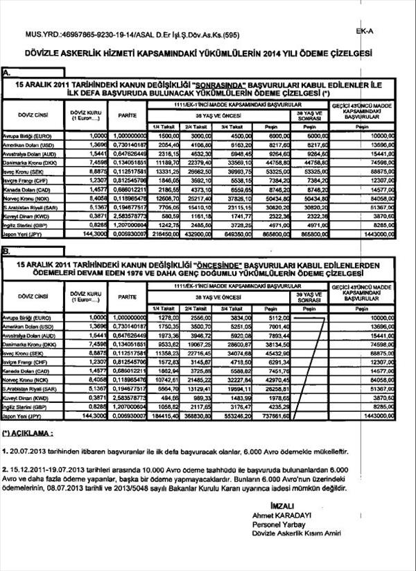 Dövizle askerlik hizmetine tabi yükümlülerin 2014 yılı ödeme çizelgesi aşağıda sunulmuştur.